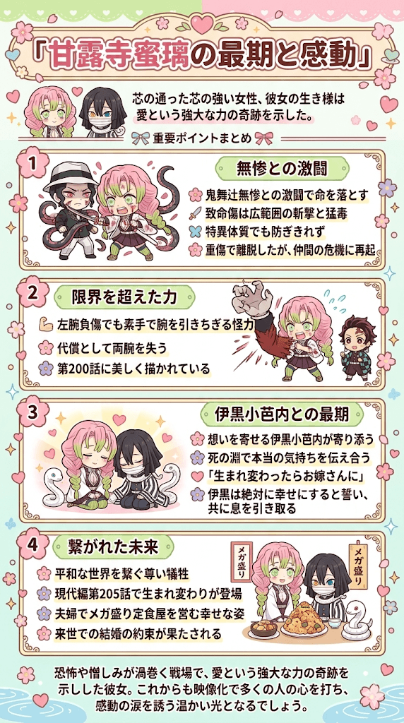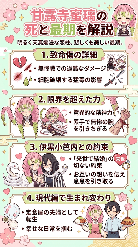 本記事では、最終決戦における彼女の活躍や致命傷となった原因、そして蛇柱との切ない約束について詳細に紐解いていきます。