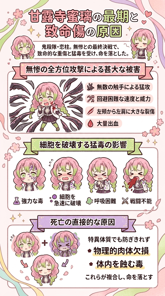 甘露寺蜜璃が死亡した理由は、鬼の始祖である鬼舞辻無惨との苛烈を極める最終決戦において、修復不可能なほどの重傷を負い、さらに体内に猛毒を打ち込まれたことが直接的な原因とされています。