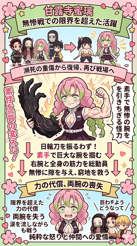 無惨の強靭な肉体を引きちぎる際、彼女自身も強烈な反動を受け、ついに両腕を失うことになります。