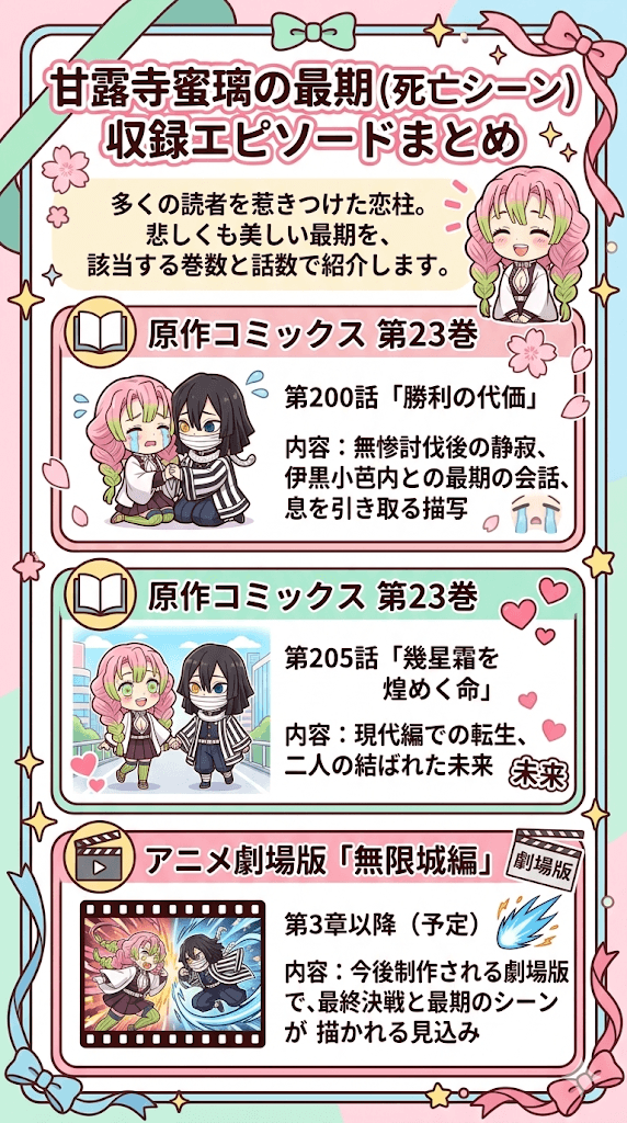 甘露寺蜜璃の最期を見届けたいと考える読者のために、該当するエピソードが収録されている巻数と話数を整理しておきます。