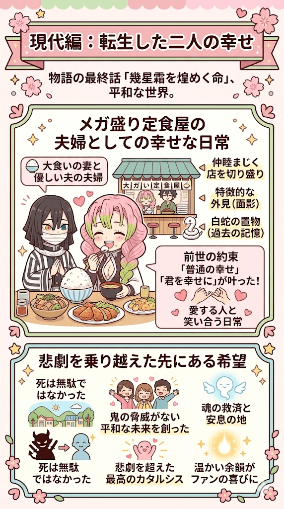 前世で彼女が望んだ「普通の女の子としての幸せ」と、伊黒が誓った「絶対に君を幸せにする」という約束が、長い時を経てついに果たされた瞬間です。