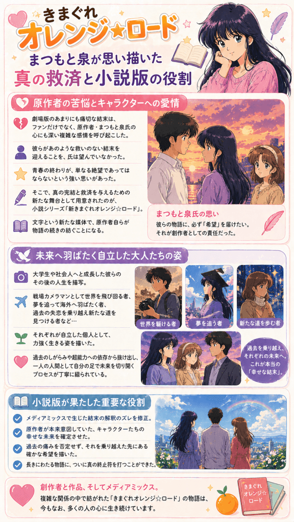 そこで、物語を真の意味で完結させ、傷ついたキャラクターたちに救済を与えるための新たな舞台として用意されたのが、後に発表された小説シリーズ『新きまぐれオレンジ☆ロード』でした。