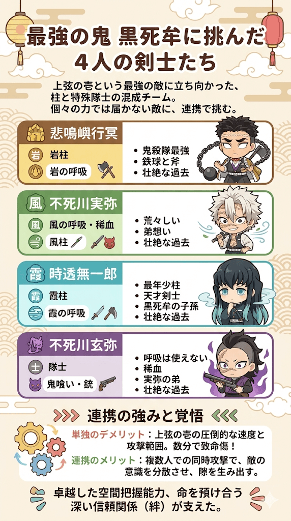 作中で最強の敵陣営に君臨する上弦の壱に立ち向かったのは、鬼殺隊の中でもトップクラスの実力を持つ柱たちと、特殊な能力を持つ若き隊士からなる4人の混成チームでした。