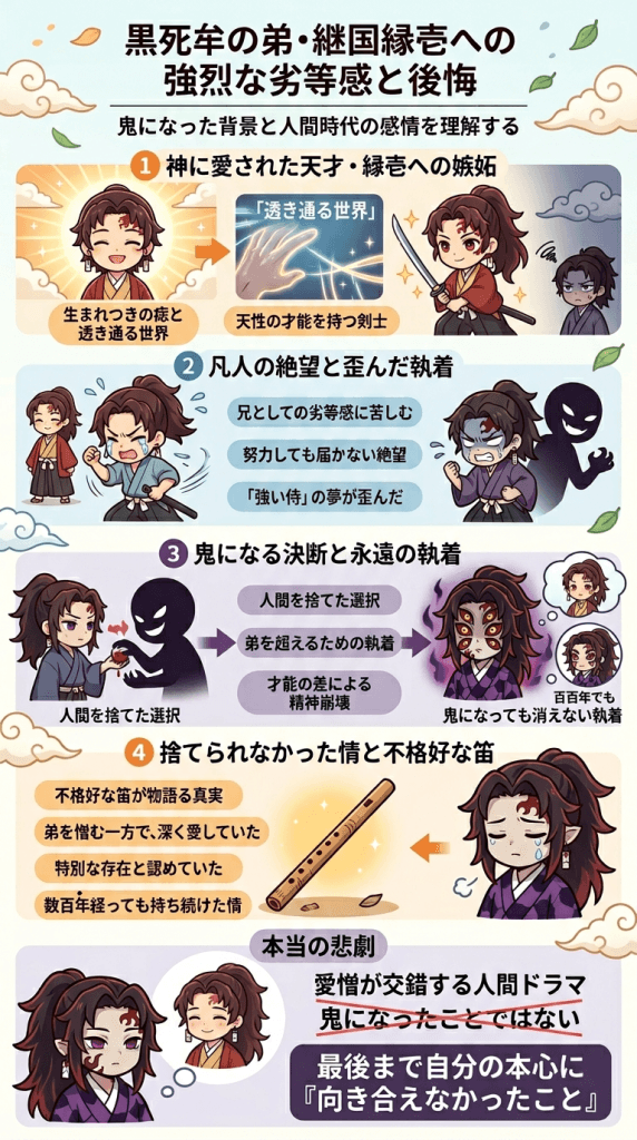 彼が鬼に堕ちた最大の理由は、双子の弟である継国縁壱に対する異常なまでの嫉妬とコンプレックスでした。