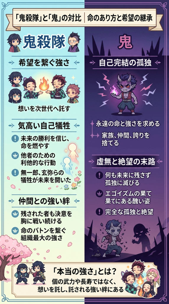 - 次世代へと思いを繋いだ鬼殺隊と自己完結した鬼の対比