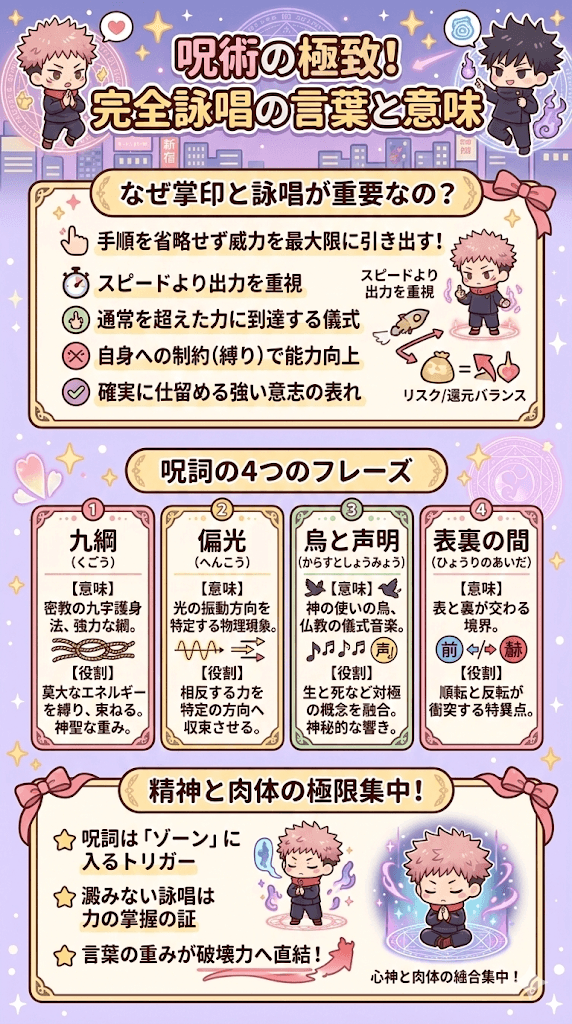 呪術においては、術式を発動する際の手順を省略せず、掌印を結び、呪詞を詠唱することで、威力を最大限に引き上げることができるという法則が存在します。