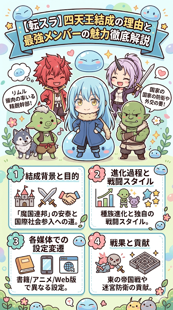 その中でも特に強大な力を持つキャラクターたちが集められた称号が転スラの四天王です。彼らは単なる戦闘要員にとどまらず、国家の防衛や外交においても重要な役割を担う存在として描かれています。