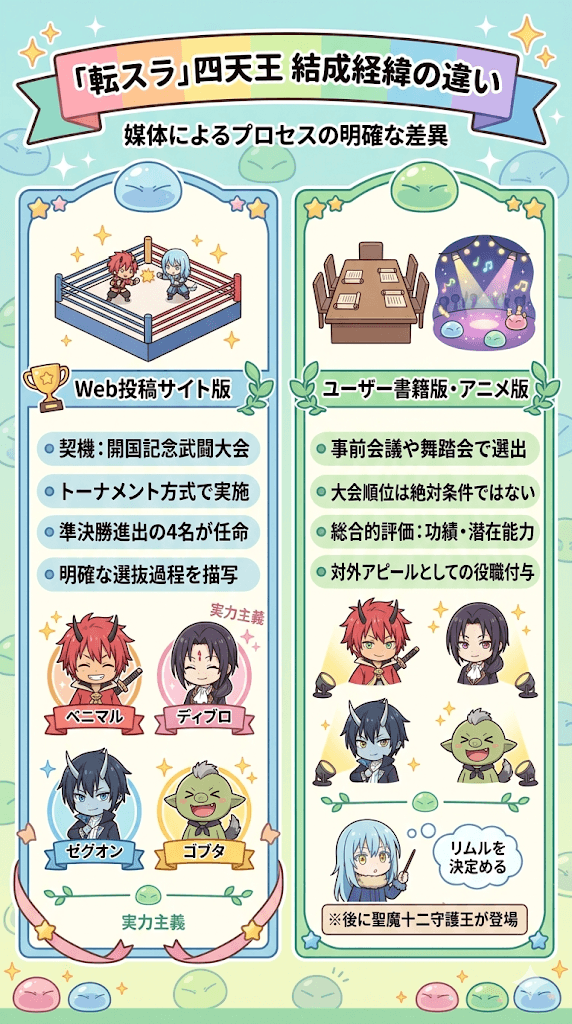 一方、書籍版およびそれをベースとした漫画版やアニメ版では、開国祭の開催に向けた事前会議や、祭りの一環として開かれた舞踏会の場で、リムルの判断により選出されるという形に変更されています。