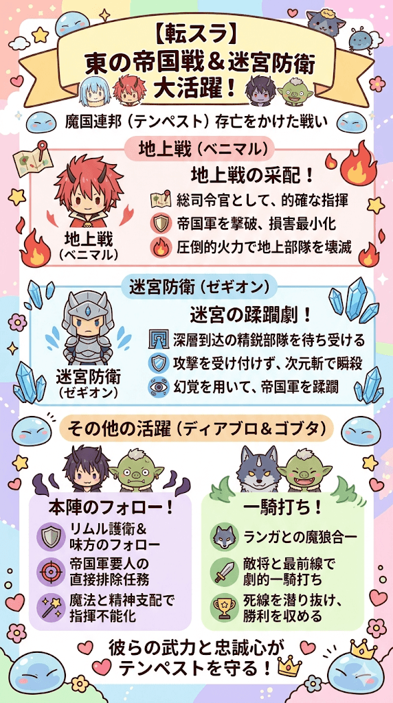 - 地上戦ではベニマルの采配により帝国軍百万の侵攻を完全に食い止めた