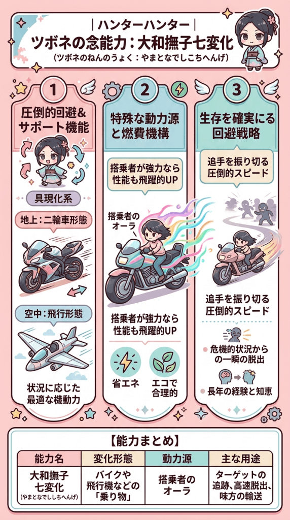 この能力は大和撫子七変化と名付けられており、自身の肉体を様々な形状の乗り物に変化させることができます。