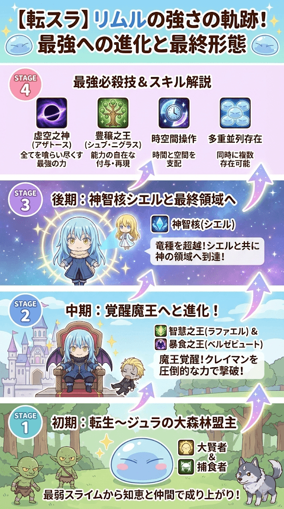 この記事では、リムルがどのようにして最強の座へと至ったのか、その進化の歴史を初期から最終形態まで、詳細なデータと共に振り返っていきます。
