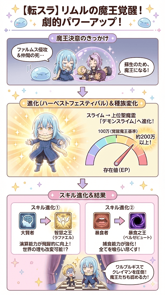 魔王への進化(ハーベストフェスティバル)を経て、リムルはスライムから精神生命体である上位聖魔霊「デモンスライム」へと進化。存在値は覚醒魔王級の基準である100万を大きく超え、約200万以上に達しました。