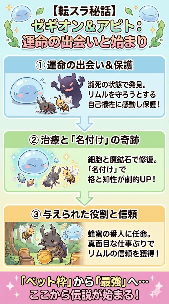 オークロード事件後、リムルが森を探索中に発見したのは、瀕死の重傷を負ったカブトムシ型の魔獣(ゼギオン)とハチ型の魔獣(アピト)でした。