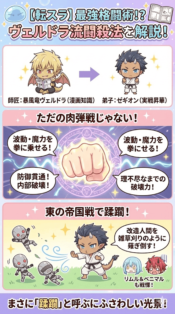 ヴェルドラは、漫画や格闘技の知識をゼギオンに伝授し、それを実戦で使えるレベルにまで昇華させました。