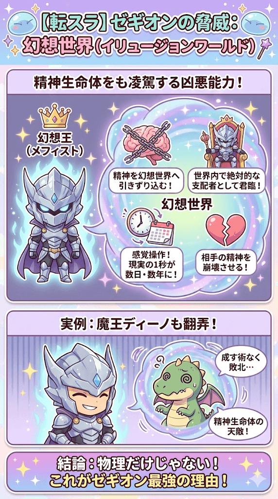 彼は精神干渉系の能力にも長けており、特にユニークスキル(後にアルティメットスキルへ進化)である「幻想王(メフィスト)」の権能「幻想世界」は凶悪です。