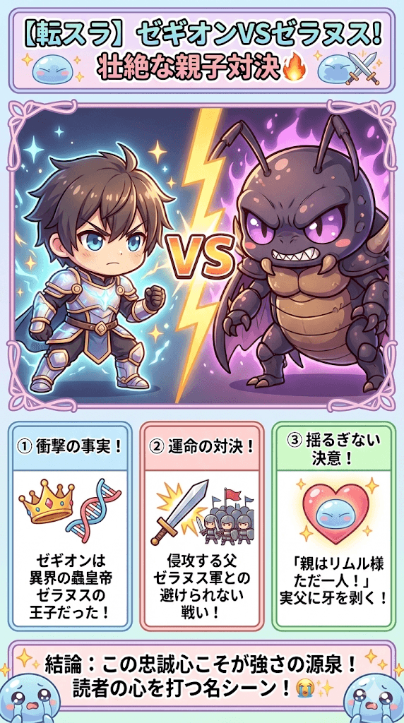 彼は「自分にとっての親は、命を救い育ててくれたリムル様ただ一人」と断言し、実の父であるゼラヌスに牙を剥きます。