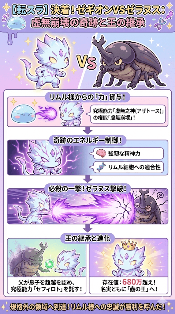ゼギオンは、リムルのアルティメットスキル「虚無之神(アザトース)」の権能である「虚無崩壊」のエネルギーを借り受け、それを自身の体内で循環させることに成功します。