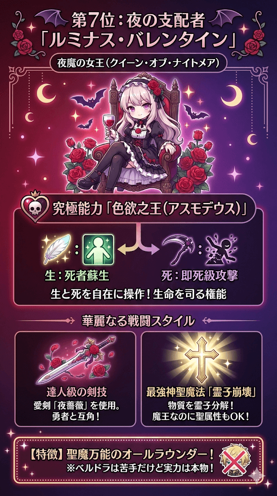 - 第7位:生と死を司る吸血鬼の女王、ルミナス・バレンタイン
