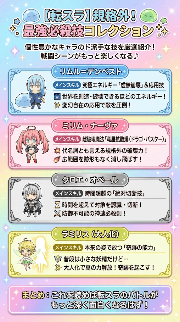 この記事では、主人公リムルをはじめ、ミリム、クロエ、ヴェルドラといった主要キャラクターたちの「最強の技」を厳選して紹介します。