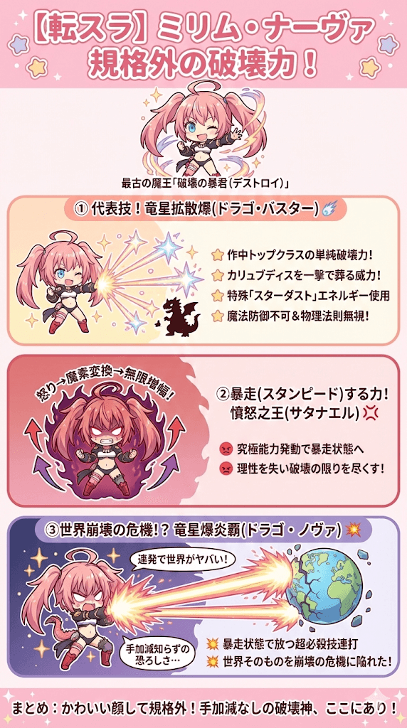 - ミリムの「竜星拡散爆」は物理法則を無視する威力だが、暴走時の危険性は計り知れない