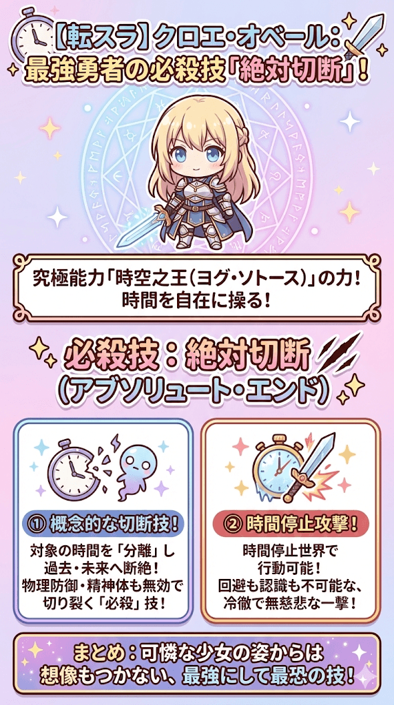 - クロエの「絶対切断」は時間を操る概念攻撃で、回避不可能な必殺の一撃