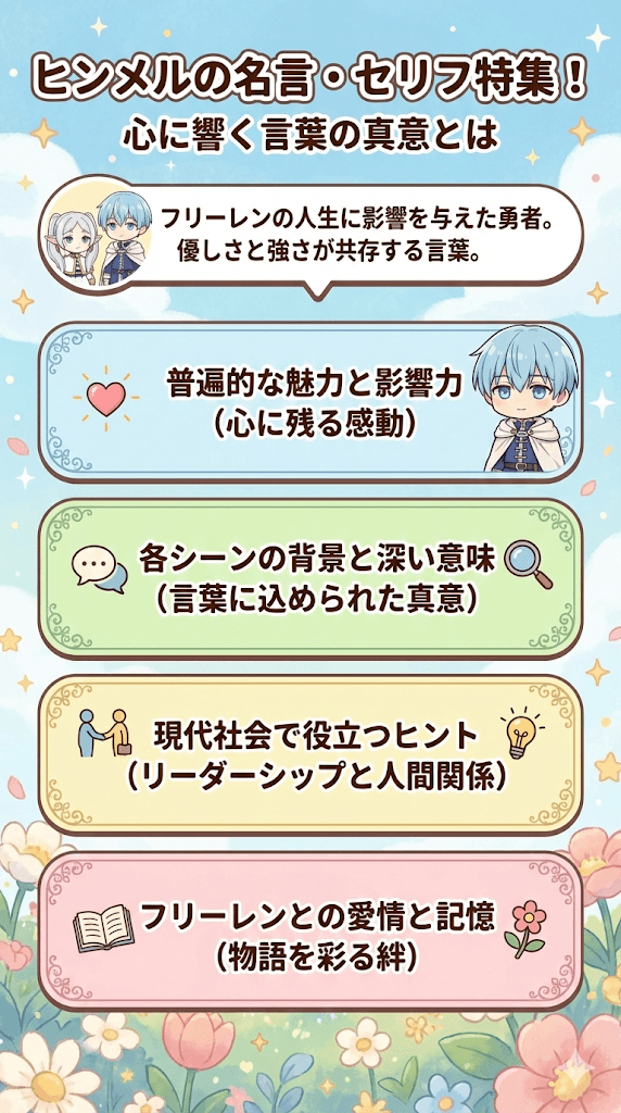 本記事ではヒンメルが遺した数々の名言やセリフを振り返りながら、そこに込められた真意や人生における大切な教訓を紐解いていきます。