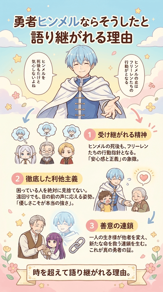 これこそがヒンメルが真の勇者と呼ばれる所以であり、彼の言葉が時を超えて語り継がれる理由なのだと言えます。