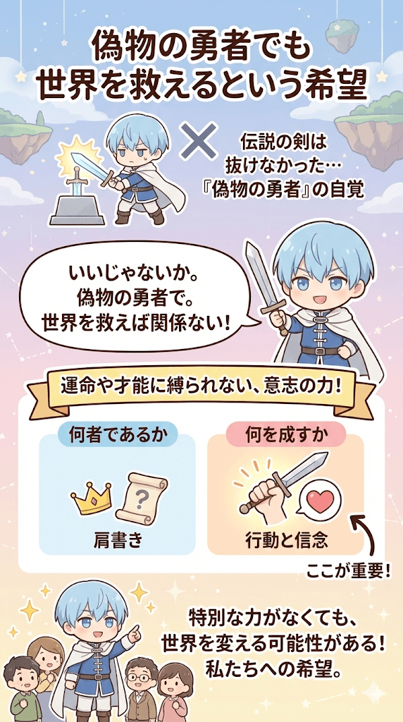 偽物の剣で魔王を倒した彼の偉業は、特別な力を持たない私たち一人ひとりにも、世界を変える可能性があるという希望を与えてくれるのです。