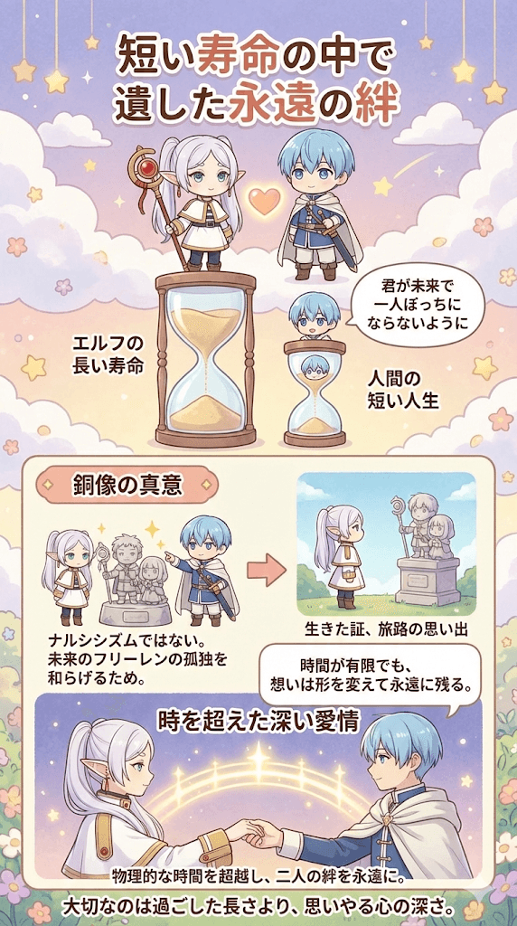 彼が各地に自分の銅像を作らせた理由は、ナルシシズムからではなく、自分がいなくなった遥か未来でフリーレンが孤独を感じないようにするためでした。