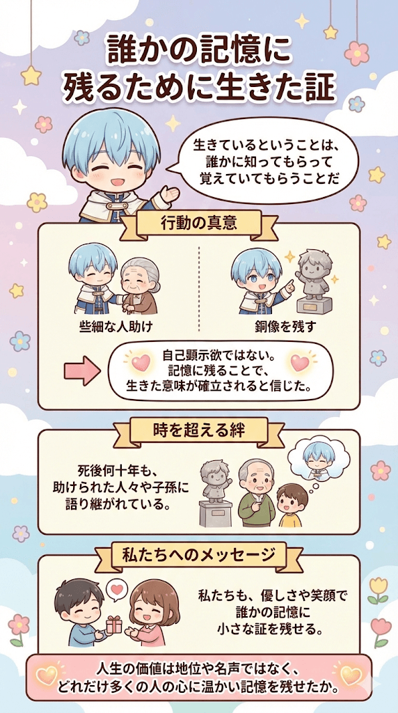 彼が些細な人助けを繰り返したり、銅像を残したりしたのは、単なる自己顕示欲ではありません。