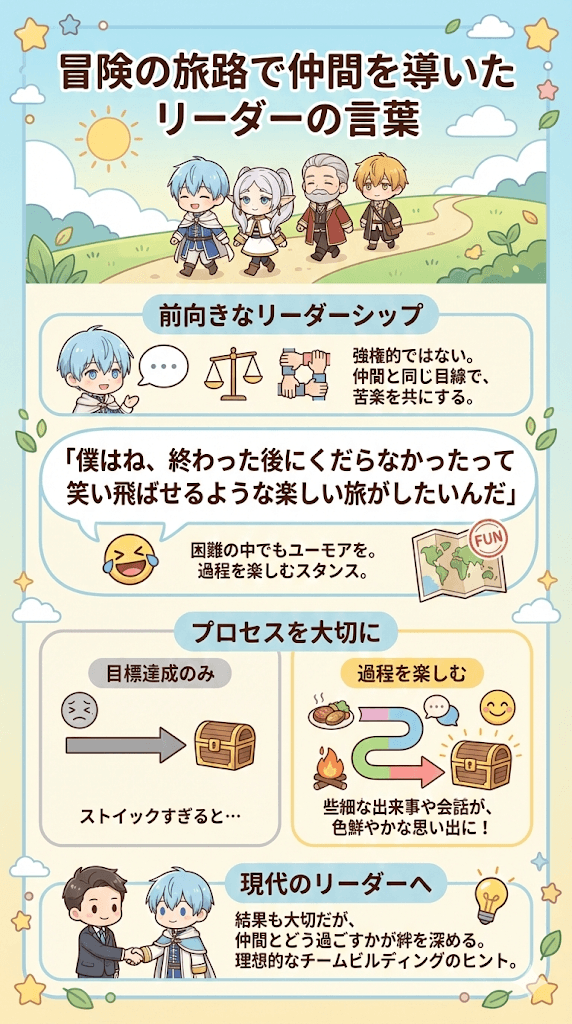 - 冒険の旅路で仲間を導いたリーダーの言葉