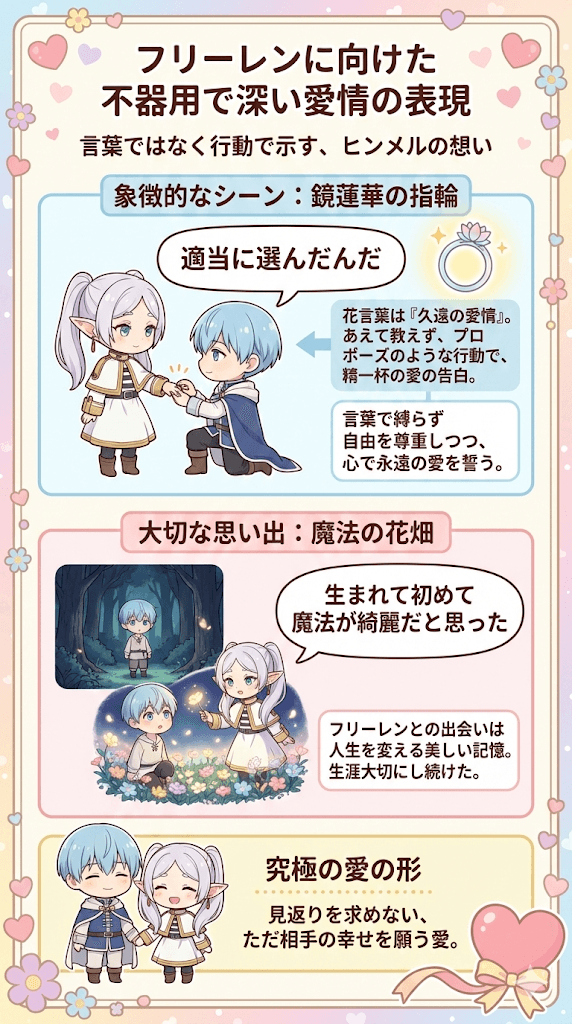 ヒンメルからフリーレンへの感情は、言葉ではっきりと「愛している」と伝えられることはありませんでしたが、数々の行動やセリフの端々に深い愛情が滲み出ています。