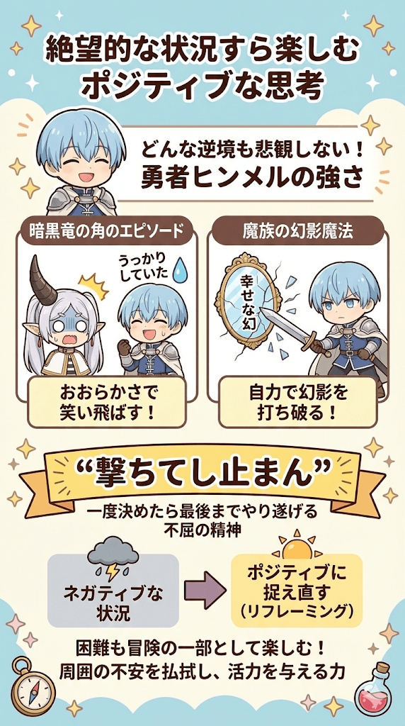 魔王討伐という過酷な旅路において、ヒンメルは常に前向きな言葉でパーティを牽引しました。