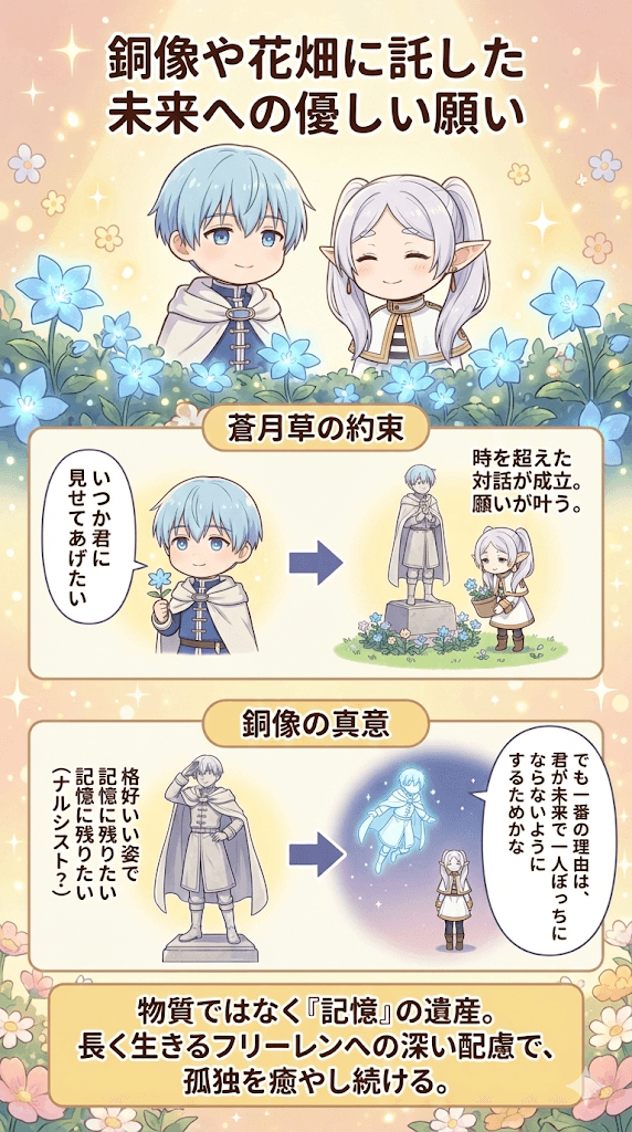 彼が世界各地に残した銅像や、フリーレンの故郷の花である「蒼月草」への執着には、すべてフリーレンへのメッセージが込められています。