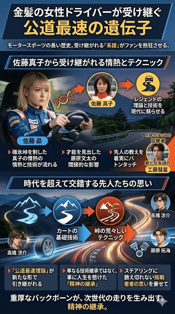 金髪の女性ドライバーである佐藤昴は、単に速さを追求するだけでなく、過去のレジェンドたちが築き上げてきた理論や技術を現代に蘇らせるという重要な役割を担っています。