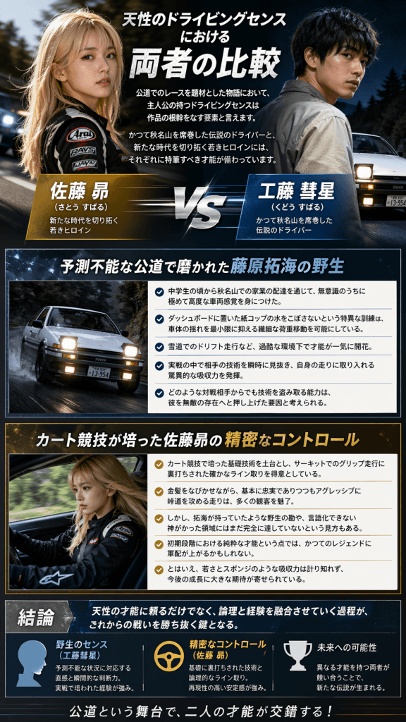 かつて秋名山を席巻した伝説のドライバーと、新たな時代を切り拓く若きヒロインには、それぞれに特筆すべき才能が備わっています。