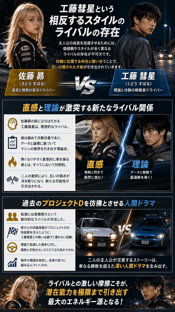 啓介との切磋琢磨がプロジェクトDの快進撃を支えたように、工藤彗星との戦いは避けて通れない試練です。