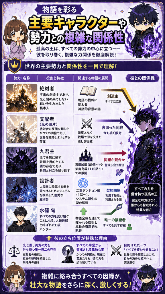 彼を取り巻く環境をより深く理解するためには、作中に登場する他の勢力との複雑な力関係を整理することが役立ちます。