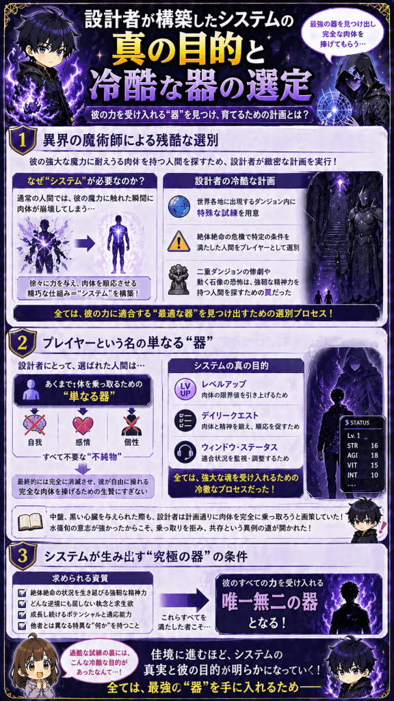- 設計者は二重ダンジョンを利用してシステムを作り上げ適切な器の選別を行った