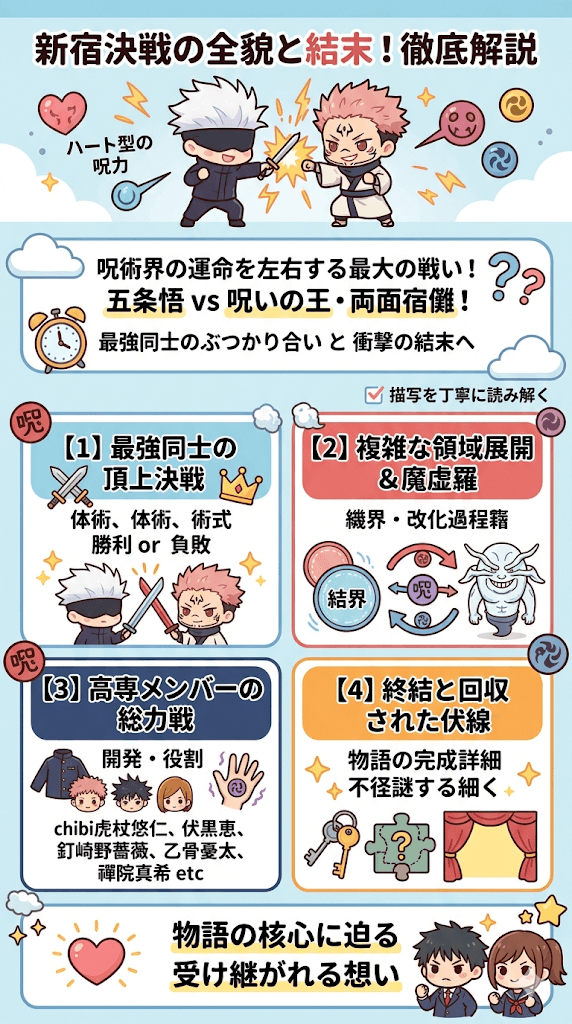 五条悟の戦いの結末や両面宿儺の圧倒的な強さ、そして呪術高専の生徒たちがどのように立ち向かっていったのか、詳しく知りたいと考えている方も多いはずです。