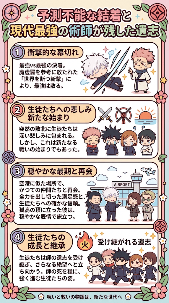 この敗北は、残された呪術高専の生徒たちにとって計り知れない悲しみをもたらす出来事でしたが、同時に新たな戦いの始まりでもありました。