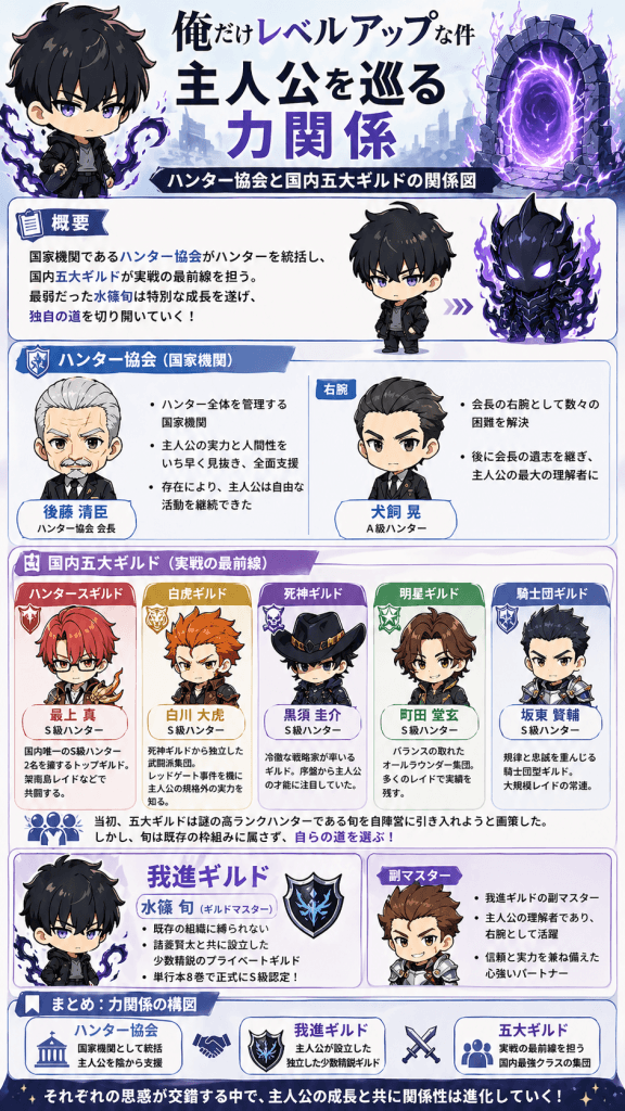 俺だけレベルアップな件相関図において最も身近でありながら複雑な人間模様が描かれるのが、ハンター協会と国内を代表する五大ギルドの存在です。