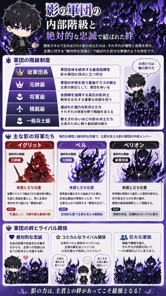 単なる召喚獣の枠を超え、それぞれが強烈な個性と自我を持つ影の兵士たちは、俺だけレベルアップな件相関図の中でも特異で熱い関係性を築いています。