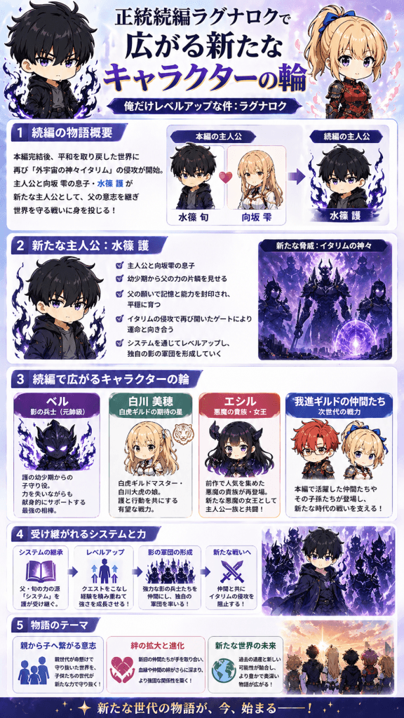 この新シリーズでは、主人公と向坂雫の間に生まれた息子である水篠護が新たな物語の主人公として設定されており、俺だけレベルアップな件相関図は次世代へと大きく拡張していくことになります。