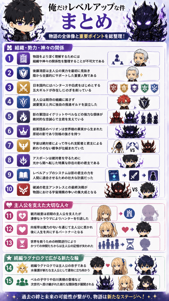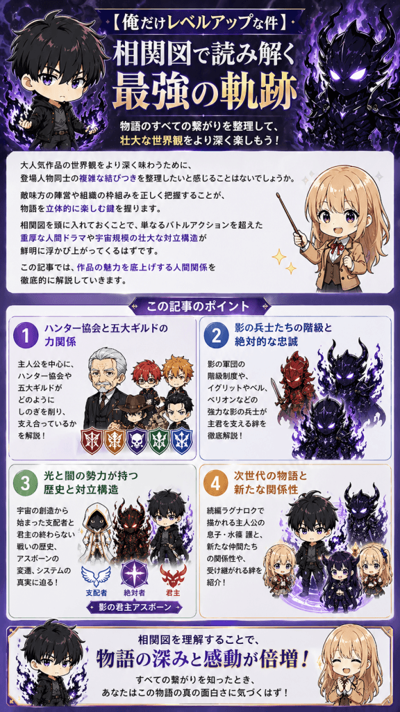 この記事では各ギルドの勢力図から最強の影の兵士たちの階層そして神にも等しい超越者たちの対立まで作品の魅力を底上げする人間関係を徹底的に解説していきます。