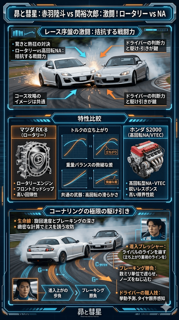 - ロータリーと高回転NAの特性を活かした緻密な心理戦が描かれている