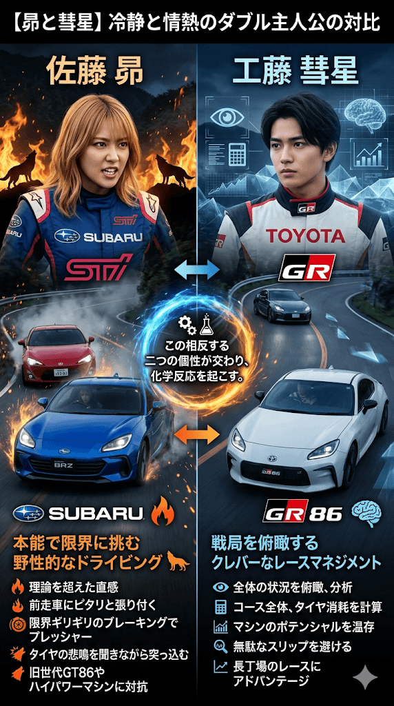 物語を牽引する二人の主人公は、全く異なるアプローチでレースに挑んでいます。