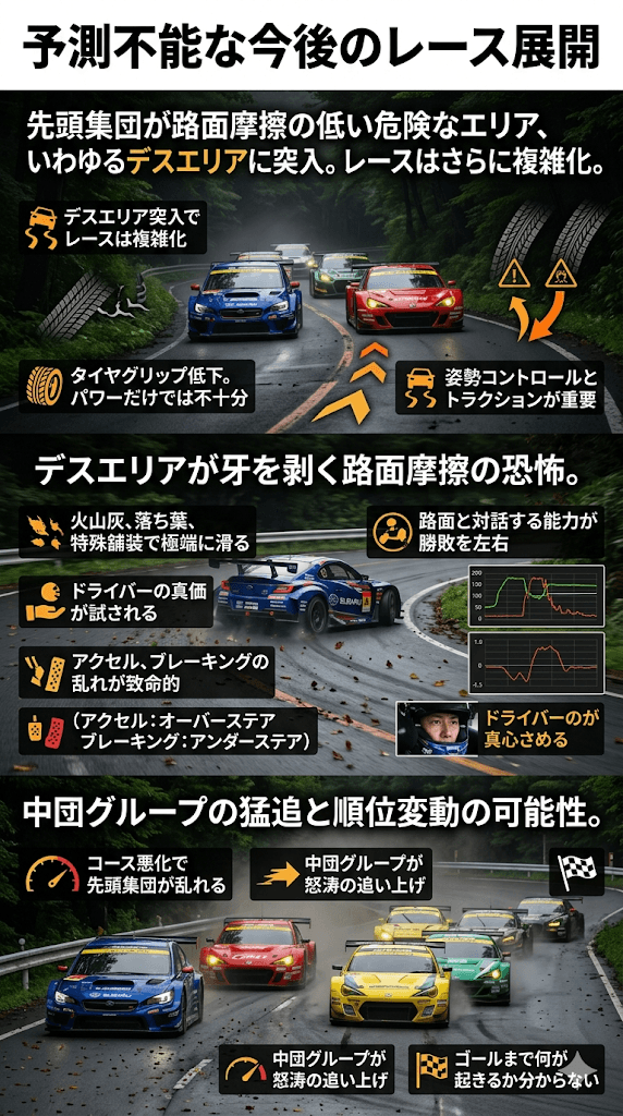 先頭集団が路面摩擦の低い危険なエリア、いわゆるデスエリアに突入することで、レースの状況はさらに複雑化します。