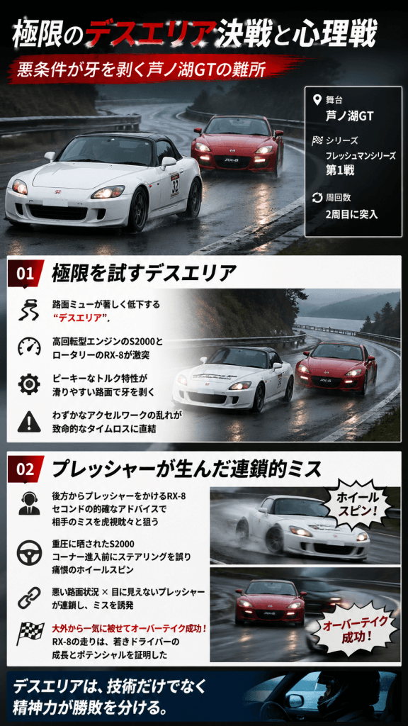 この難所において、高回転型エンジンを搭載するS2000と、ロータリーエンジンを積むRX-8による息を呑むようなサイドバイサイドのバトルが展開されました。