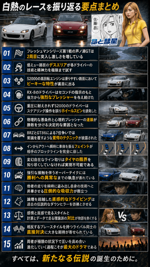 鮮やかな対比構造が、レースの展開をより一層スリリングなものへと昇華させています。読者はまるで助手席に乗っているかのような、ヒリヒリとした緊張感を味わうことになります。